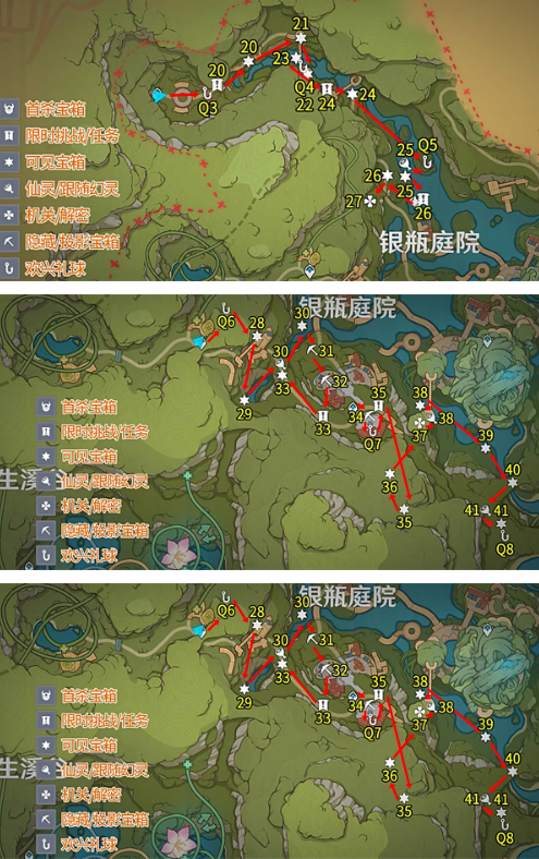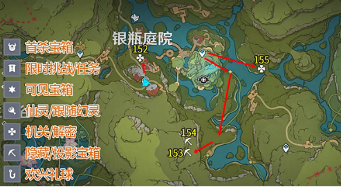 2. 银瓶庭院作为核心探索区,34处宝箱呈环形分布于建筑群周边。注意观察地面发光点与悬浮平台,部分宝箱需通过元素方碑激活获取。
