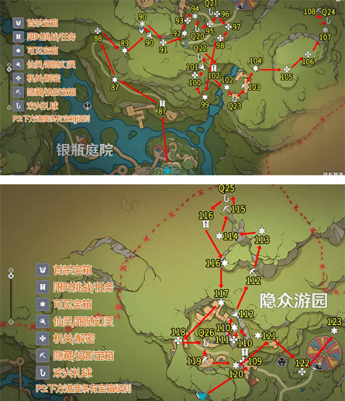 4. 隐众游园37处收集品呈螺旋状分布,建议按逆时针路线探索。注意部分宝箱需要完成限时挑战或击败守护魔物方可解锁。