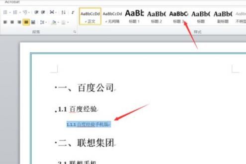 第四步处理次级标题,用鼠标拖选二级标题文本区域,在样式面板激活标题二模板。此层级标题通常采用稍小字号并带有项目符号,与主标题形成视觉区分。